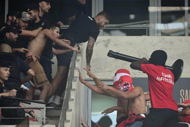 不过科隆极端球迷的主力军把最重要的剧本留在了球场。尼斯俱乐部把科隆球迷安排在球门背后的一侧,这接近200个科隆球迷就像提前踩过点或者是得到过信息,在比赛开始前45分钟即球员准备入场热身的时候,他们大摇大摆地越过看台一侧的矮墙,穿越过中央看台贵宾席,直奔另一侧球门的尼斯球迷看台。