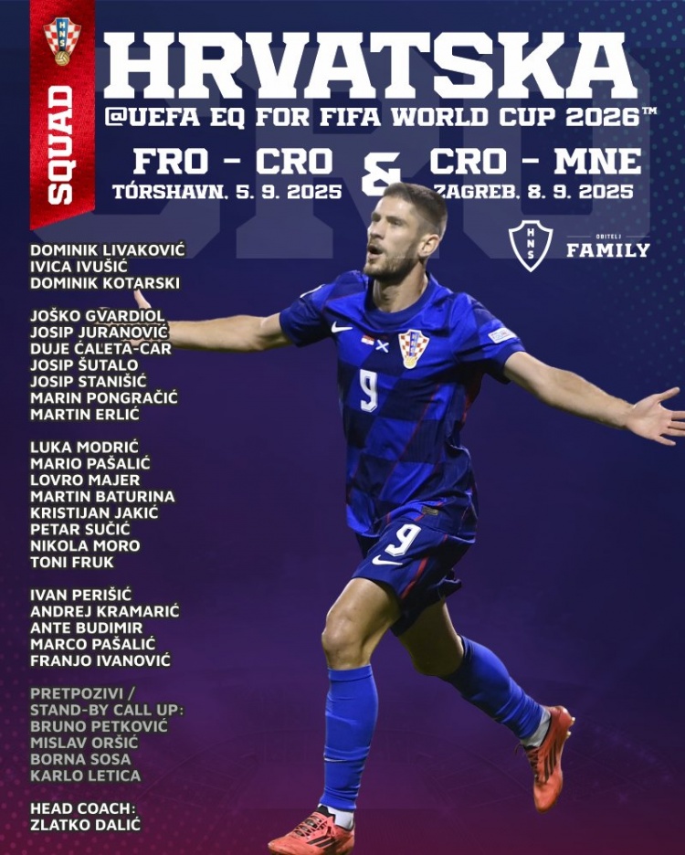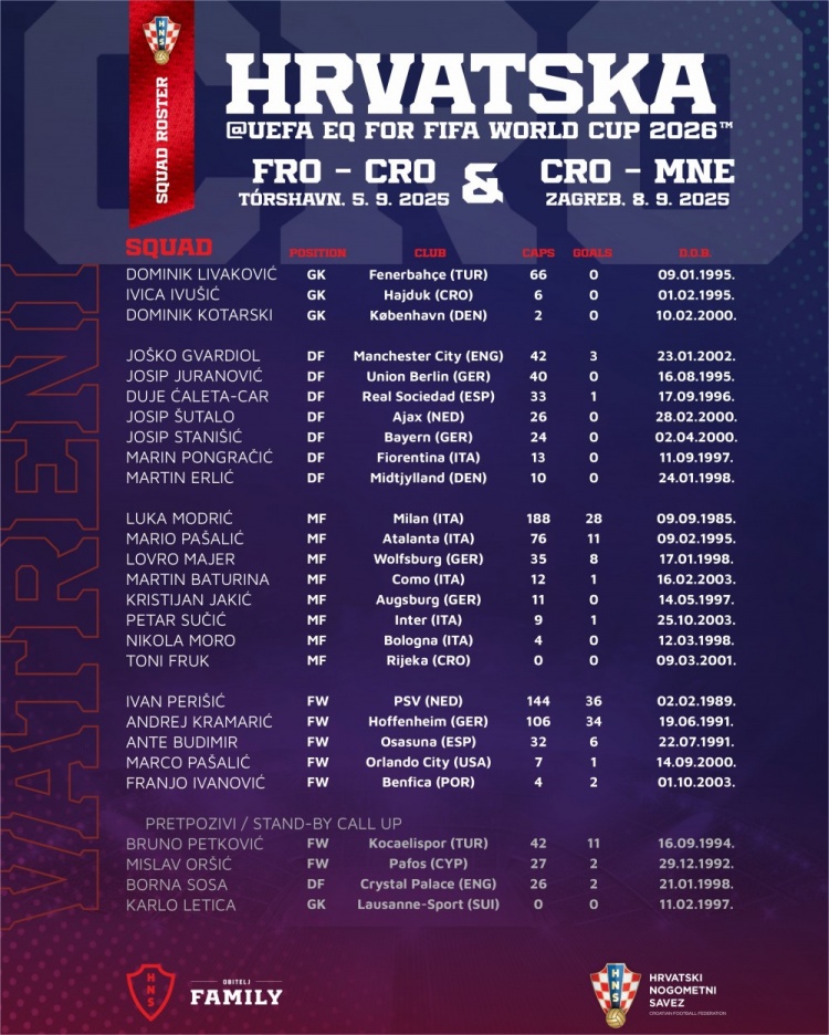 克罗地亚9月世预赛名单:魔笛领衔,格瓦迪奥尔、佩里西奇在列